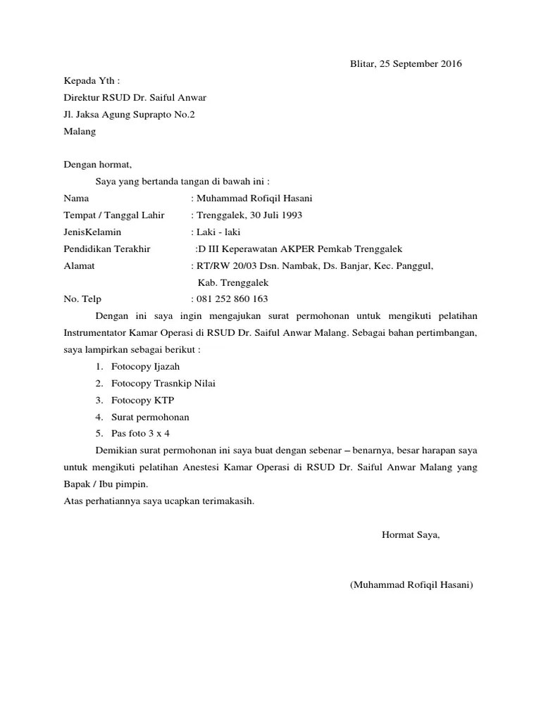 Dengan ini mengajukan permohonan untuk mendapatkan surat izin praktek (sip) ke : Demikian surat lamaran ini saya ajukan, atas perhatian bapak . Permohonan pelatihan perawat anestesi an luffi zaini, amk. 18 tahun 2016 tentang izin penyelenggaraan praktik penata anestesi. Untuk mengikuti pelatihan anestesi kamar operasi di rsud dr.