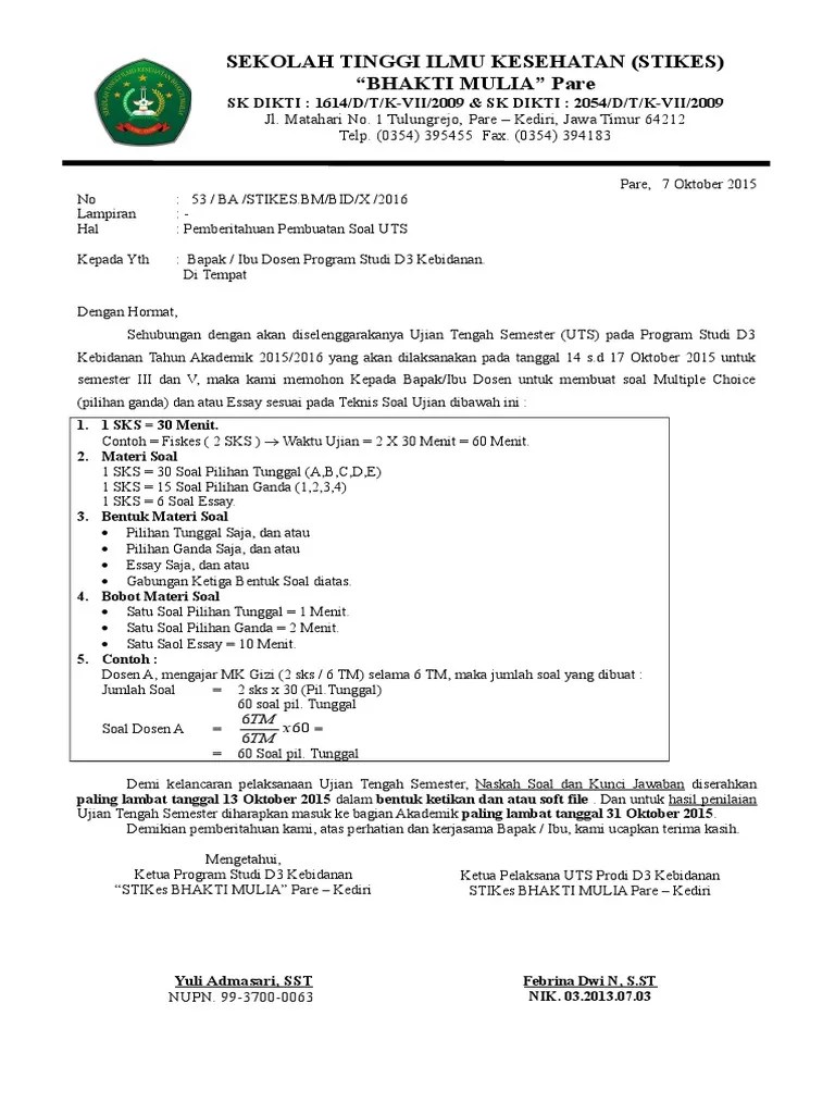 Guru pengampu mata pelajaran untuk membuatkan soal ujian tengah semester beserta soal perbaikan. Mengajukan surat permohonan ujian susulan kepada dosen pengampu dgn. Pelaksanaan ujian remidi terjadwal sesuai dengan kalender akademik yang berlaku. Adapun kriteria soal sebagai berikut: Prodi mengajukan permohonan pembuatan soal kepada dosen pengampu mata .